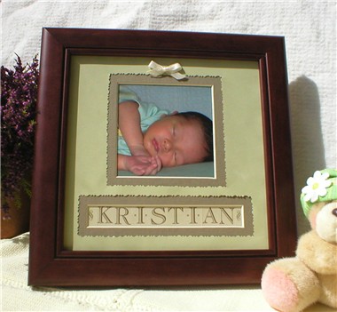 Capture a moment of your child's life and frame it in a beautiful cherry wood frame. This original design includes your child's first name. Frame size 10" x 10". For photos 4" x 4".